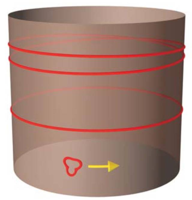 让我们回到圆的例子中。现在弦可以做两件不同的事情。第一,弦可以形成一个小圈然后绕着圆运动。因为,从远处看来,这个弦圈就是一个粒子,显然此弦圈的能量谱应该跟粒子的能量谱一样,即:。但是弦还可以做一些粒子做不到的事情:它可以拉伸自己。你可把弦想象成一条橡皮筋;拉伸需要能量,而如果一条弦绕着圆绕了 m 圈,它将会拥有的能量