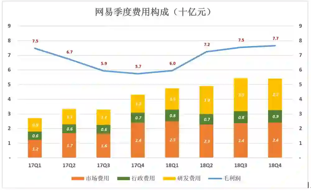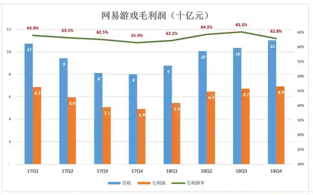 运营游戏的直接成本包括人员薪酬、带宽成本以及由购置版权或支付许可费形成的无形资产的摊销。网易游戏业务毛利润率一直在60%以上,2018年季度毛利润均值超过100亿,是不折不扣的摇钱树。