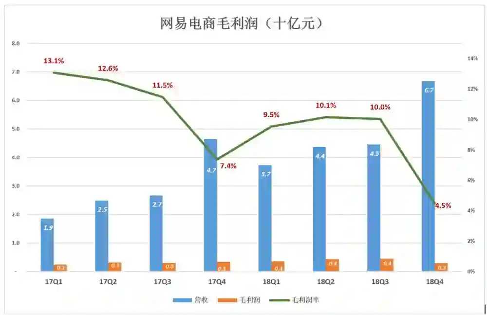 2018年Q4,电商业务收入66.8亿,毛利润不到3亿,毛利润率仅4.5%。