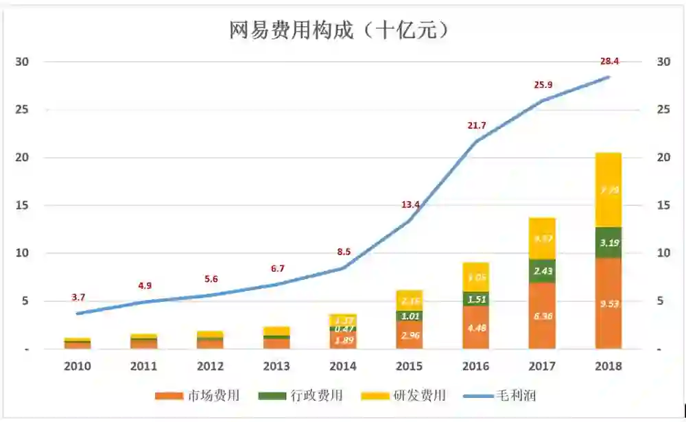2018年网易营收、毛利润分别为2010年的12.2倍和7.66倍。毛利润增速远低于营收,年均复合增长率29%。