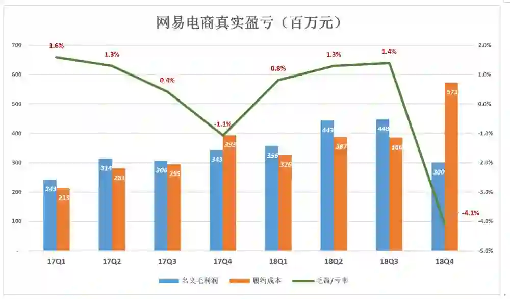 2017年Q1,网易电商“名义毛利润”为2.43亿,履约成本2.13亿,真实毛利润2952万,毛利润率1.6%,这是最近八个季度的高峰;