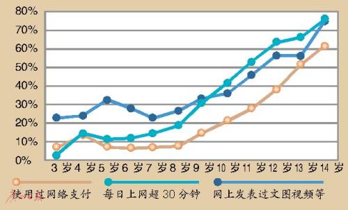 在7岁组,24.2%受访儿童研究过网游攻略,61.0%曾自主下载游戏、视频和音乐;8.5%有网购;14.4%在网络上发布过图片、视频或文字,甚至有4.7%表示拥有粉丝。