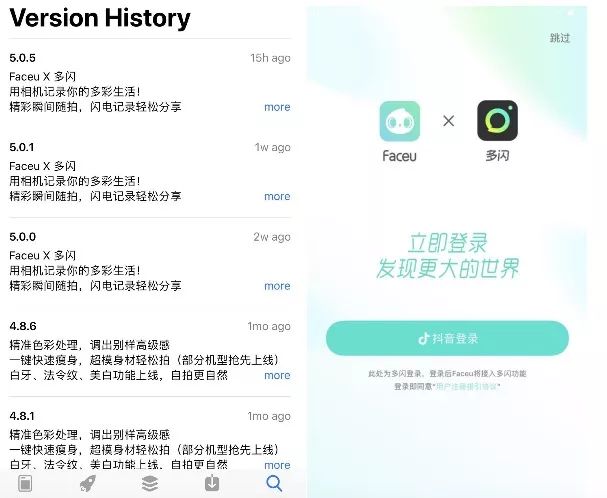 同时在最近一个月,多闪和字节跳动另一款美颜和滤镜产品faceU做了融合,大部分功能已经转移到faceU,以工具出发,打造短视频平台。