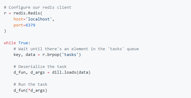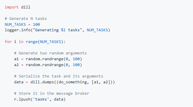 很好。我们的代码使用dill来把要执行的函数序列化为一个任务,然后存储到redis中。