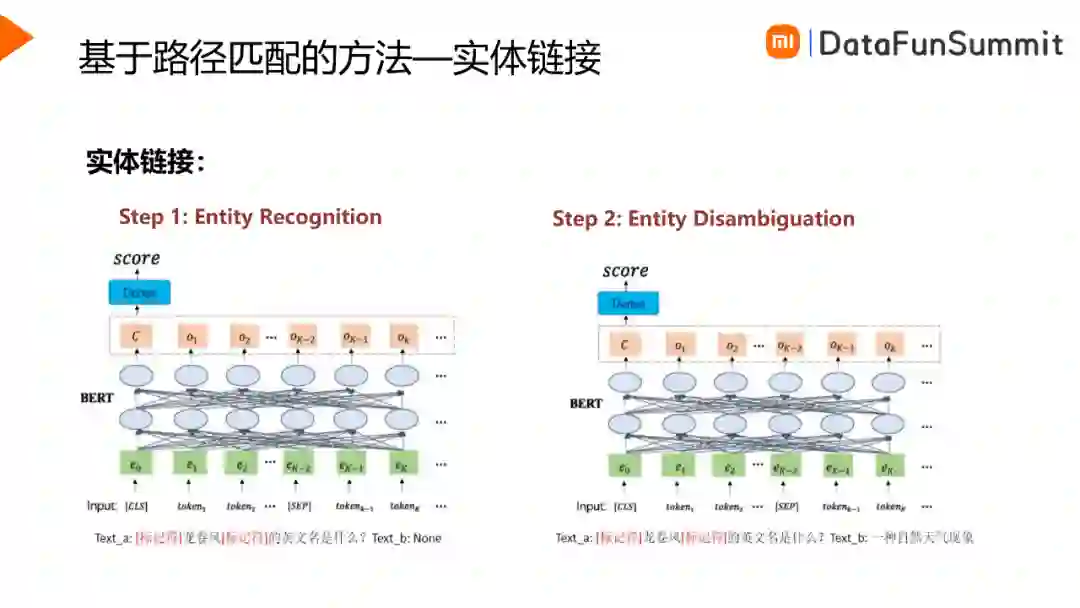 实体链接主要是从Query中寻找核心实体,如上图所示,对于Query“龙卷风的英文名是什么”,我们需要知道用户询问的核心是龙卷风。实体链接主要包含实体识别与实体消歧两方面。篇幅所限,本文不在实体链接上展开介绍。