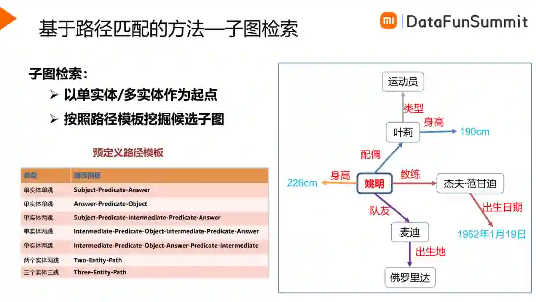 子图检索主要分为路径挖掘和约束添加两步。首先是路径挖掘,以实体链接步骤中所确定的单实体/多实体作为起点,根据定义的路径模板在图谱中挖掘候选子图。如上图所示,在“姚明”作为起点,可以得到的路径举例如下:。