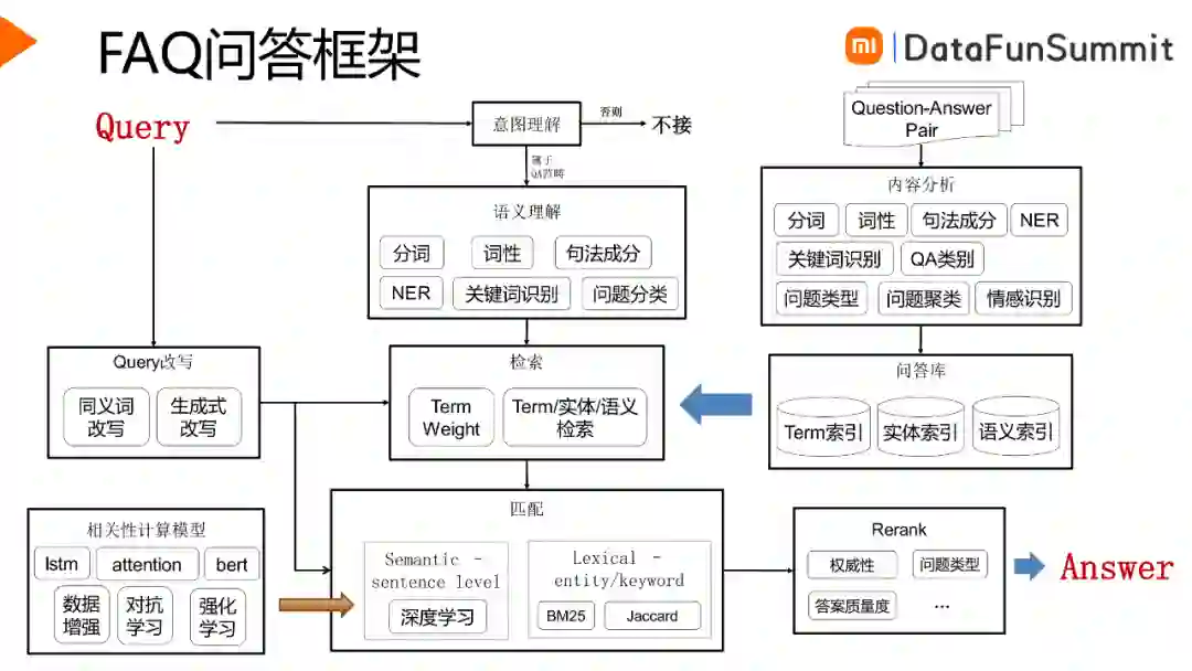 如图所示是一个FAQ问答框架,右半部分是线下工作,主要是问答库的线下建设。左半部分是线上的技术流程,主要包括意图理解、检索、语义匹配和重排序等步骤。这里,我们主要介绍检索和匹配这两个主要环节。