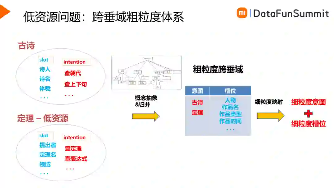 比如我们要建设古诗垂域,如上图所示,首先定义好古诗垂域下的意图与槽位,古诗相关的槽位包括诗人、诗名、体裁等,意图包含查朝代,查上下句等。根据定义好的体系,获取训练数据,之后可以进行意图/槽位联合模型的训练,最终在线上部署并生效。建立新的垂域需要进行重复的工作,另外在小垂域方面训练样本比较少,样本标注的成本相对较高,这是垂域建设面临的问题和挑战。为此我们提出了一种跨垂域粗粒度的体系,可以将意图槽位体系进行抽象与归并。假如我们要新建定理垂域,它的训练数据非常稀疏,那么我们可以对意图和槽位进行归并。比如,在槽位上,诗人与提出者都属于人物,那么我们就可以归并为人物。类似的,诗名和定理名可以归并为作品名。每个垂域独有的槽位可以直接继承下来。在意图上,直接使用两个垂类作为类别,得到粗粒度的意图体系。预测的时候,我们先得到粗粒度的意图和槽位结果,然后通过映射关系得到细粒度的意图和槽位,作为最终的解析结果。