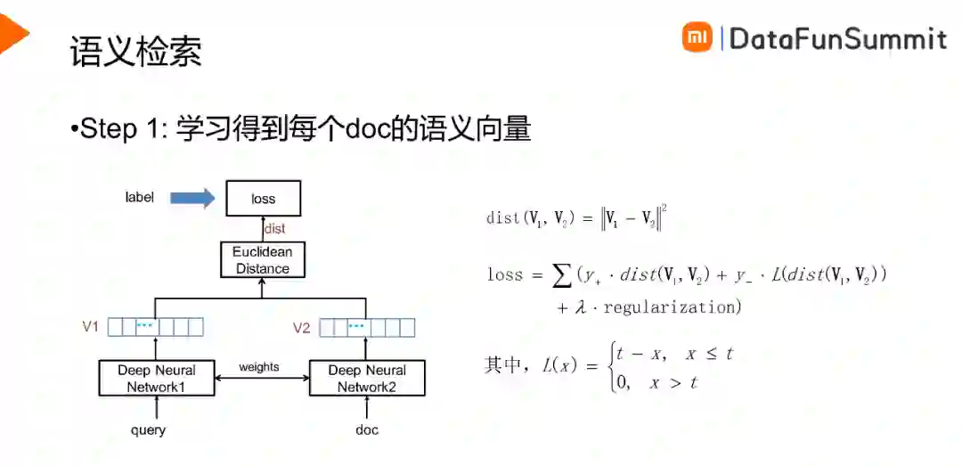 语义检索首先要得到每个doc的语义向量,其中doc指的是QA对中的相似Q。如上图所示,将Query与doc输入至孪生网络中得到两个句子的语义向量,希望正样本的距离越近,负样本的距离越大,在此监督之下对神经网络的参数进行学习。然后,我们综合考虑效果和性能,选择最合适的孪生网络,并用于推理得到全量QA数据的语义向量。在线上,搭建faiss语义检索服务,以docid作为key,语义向量作为value,寻找最近邻doc,并通过docid获取doc内容。