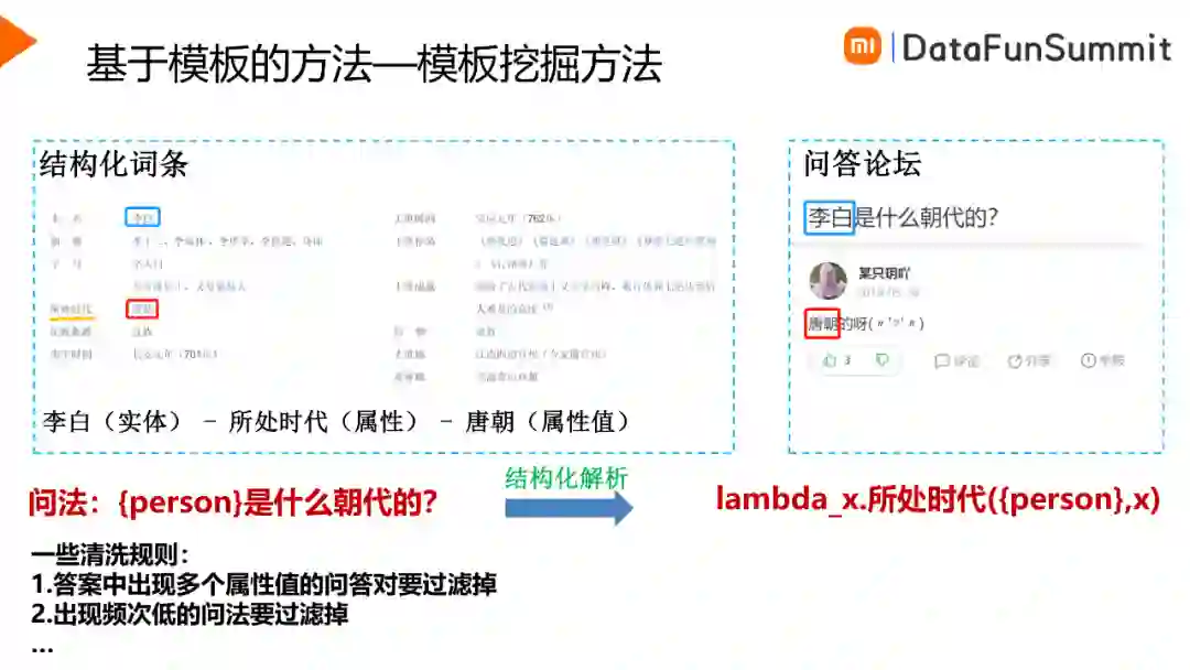 如上图所示,是一个快速获取批量模板的方法。例如有一个结构化的词条李白,词条当中有一个属性“所处时代”对应的取值为“唐朝”,如果一个问答对中的Query包含“李白”,Answer中包含“唐朝”,那么这个问答对很有可能询问的就是“所处时代”这个信息,因此就可以得到一个模板“xxx是什么朝代的”。依次类推遍历所有问答对数据,对模板进行频次统计,通过人工过滤就可以得到高质量的模板库。