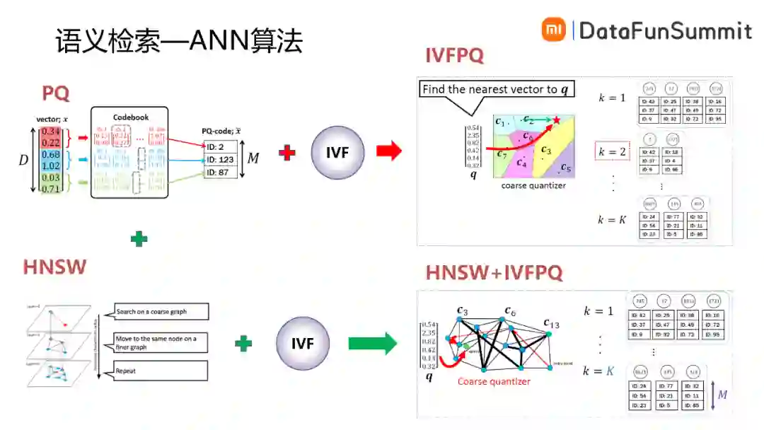线上全量检索时,用户Query的语义向量与doc的语义向量一一进行匹配计算对服务的性能要求很高,另外加载全部的数据内存占用也比较大。研究者提出了很多ANN最近邻算法优化检索性能。如上图所示,IVF的思路是将doc向量进行聚类,找到与用户Query最近的类,然后在类内找到最近的语义向量,这样可以明显减少耗时,但无法解决语义向量占用内存高的问题。PQ则是牺牲一定的精度,将高维语义向量进行降维,获取更低的内存占用。将PQ与IVF联合可以得到IVFPQ,它首先找到与用户Query最近的类,将类内的语义向量进行降维,这样既可以降低内存占用,又可以提升性能。HNSW是一个分层的最近邻网络,越上层是越粗略的层,越下层是越细致的层。首先根据用户Query在最上层找到最近的节点,然后映射到下一层找到下一层中最近的点,依次类推得到最后的结果。它同样可以与IVF进行结合得到HNSW+IVFPQ的检索方式。