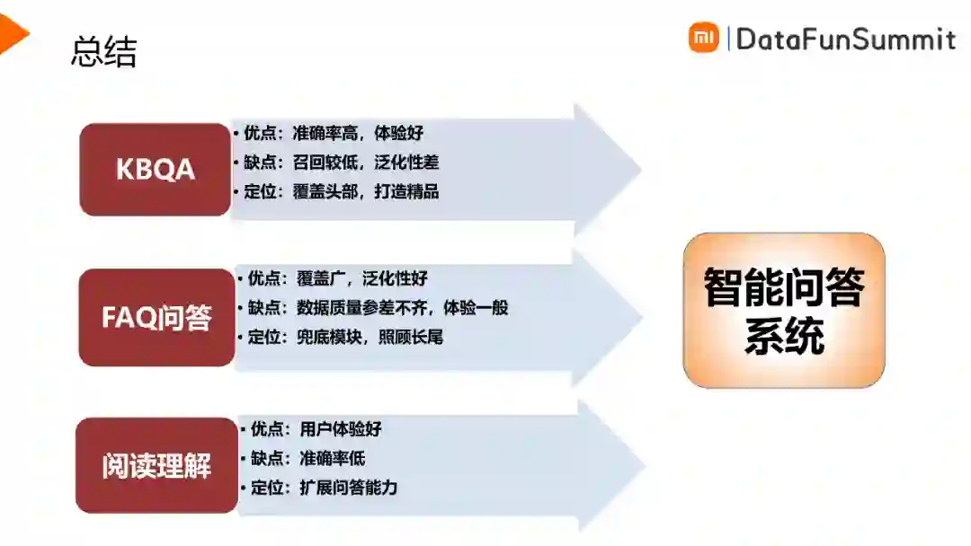 智能问答系统运用到三个形式的问答技术,分别是KBQA、FAQ与阅读理解。KBQA的优点是准确率高,体验较好,缺点是召回低,定位是覆盖头部,占据主要的流量。FAQ的优点是覆盖广,泛化性好,缺点是数据质量参差不齐,体验一般,定位是兜底模块,照顾长尾。阅读理解的优点是用户体验好,缺点是准确率低,定位是扩展问答能力。