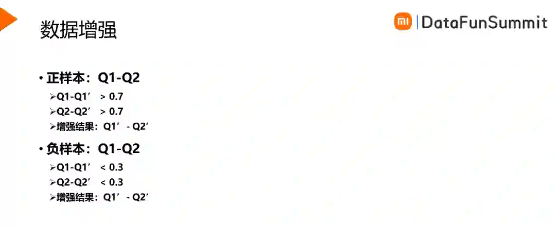 高质量的人工标注数据对匹配模型的效果影响很大,所以我们尝试了通过数据增强来提升人工标注数据的样本量。如图所示,一对正样本Q1与Q2,可以分别找到Q1、Q2的相似性样本Q1’与Q2’,可以得到增强的结果Q1’与Q2。同样类似的方法可以构造负样本,以此提升语义匹配效果。