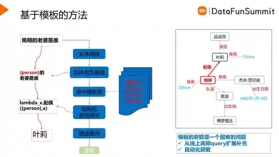 基于模板的方法相对比较简单,核心思想主要是在模板库中找到与用户Query最相似的模板,根据模板对应的解析从图谱中达到答案,以此来回答用户的问题。在这个过程中,模板获取是一个困难的问题,可以人工从线上高频Query进行扩展补充,另外也可以通过自动化的手段快速获取大批量的模板。