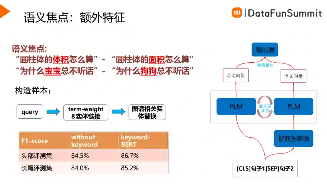 语义匹配方面会遇到语义焦点的问题,例如“圆柱体的体积如何计算”和“圆柱体的面积怎么算”,这两个句子只有核心词不一样,会容易造成模型误判,因此可以引入一些额外特征强化模型对核心词的学习。如上图所示,额外特征为提取的关键词,通过PLM对关键词进行表征,并与原句子的特征进行级联以计算相似度。