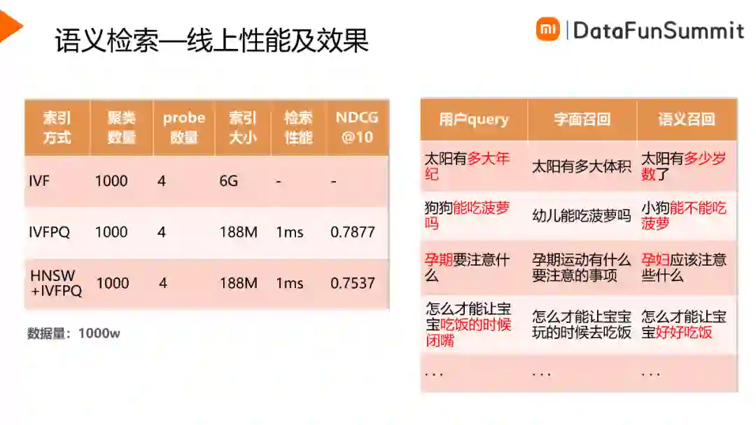 如下图所示是语义检索性能与效果的实验对比,在1000w的数据下,IVF检索的内存占用是6G,内存占用偏高。IVFPQ的内存占用下降到188M,检索耗时是1ms,HNSW+IVFPQ在内存占用与检索性能上相差不大,在效果上稍差,最终我们选用的是IVFPQ的检索方式。通过语义索引可以解决线上的一些badcase,例如“太阳有多大年纪”,term检索通道召回的可能是“太阳有多大体积”,通过语义检索可以召回“太阳有多少岁数了”。