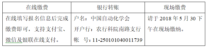 ①2018年05月29日(含)前注册并缴费:自动化学会会员2000 元/人,非会员报名同时入会2500元/人;②现场缴费:会员2500元/人,非会员3000元/人(包含提前报名现场缴费、现场报名现场缴费);③在校生参会可享受学生优惠价格1200元/人;④公务卡缴费可现场刷卡,但需要提前提交报名信息方可按优惠价格缴费;⑤自动化学会团体会员参加,按会员标准缴费;⑥同一单位3人及以上团体报名,按会员标准缴费。