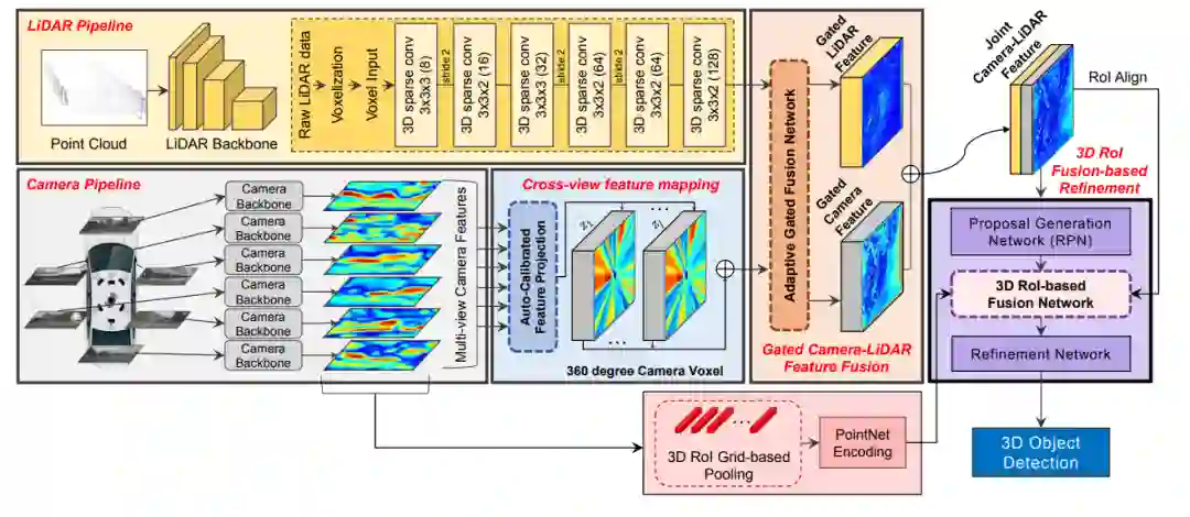这篇发表在ECCV20的多模态融合的文章网络结构图如下所示,该特征融合阶段为对特征进行融合,同时对于点云的backbone采用voxel-based的方法对点云做特征提取。所以这里需要解决的核心问题除了考虑怎么做特征的融合还需要考虑voxel-center作为特征载体和原始点云坐标存在一定的偏差,而如果将图像信息索引到存在偏差的voxel中心坐标上,是本文解决的另外一个问题。