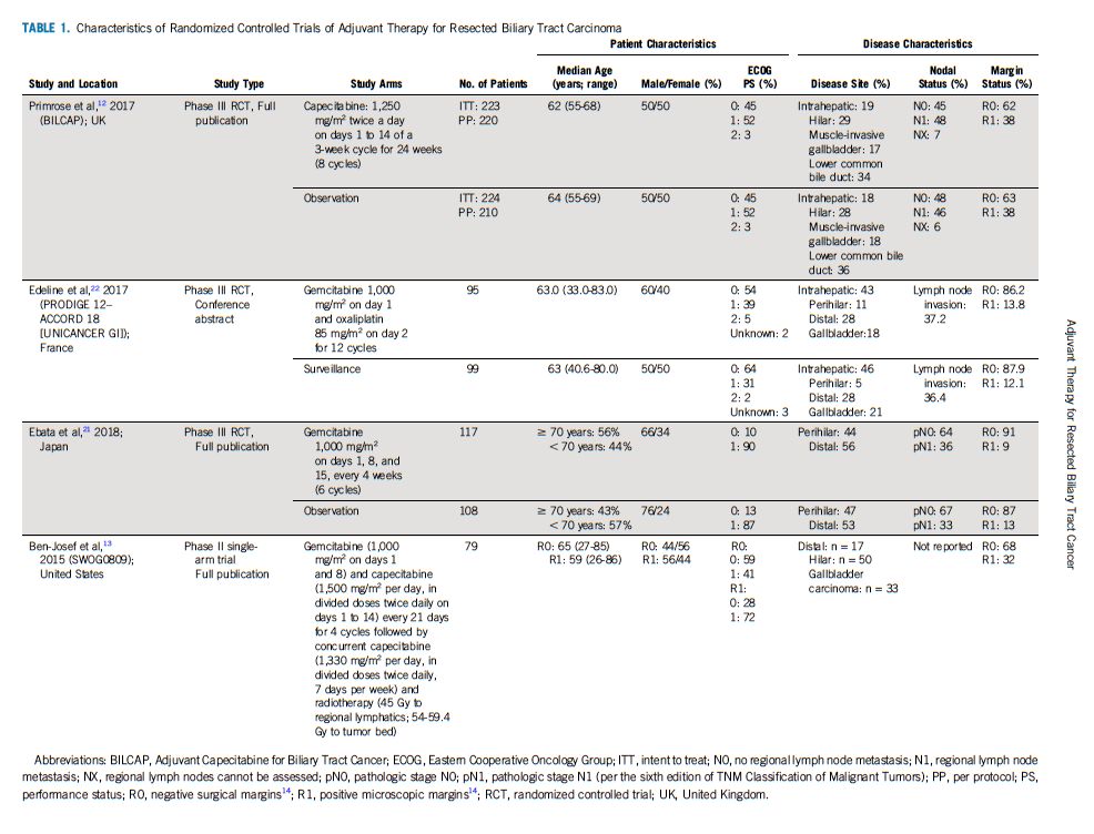 表1. 胆管癌患者辅助治疗相关随机对照研究的特征汇总