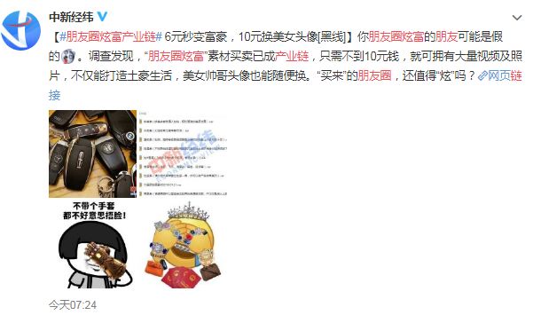 “朋友圈炫富”素材买卖已经形成产业链,只需不到10元钱,就可拥有大量视频及照片,不仅可以打造“土豪”生活,美女帅哥头像也可以随便换。