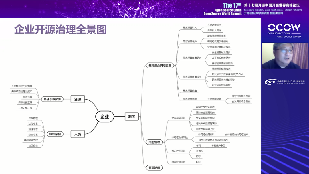 中兴通讯云基础设施开源与标准总监李响表示开源软件在给我们带来很多好处的同时,其中也潜藏了很多风险。而企业的开源治理,则重在对风险的管理和管控。总的来说可以分为三个方面:首先,企业需要建立一套完整的开源治理制度。其次,在人员方面,需要将专业的人才纳入其中,各种角色都必不可少。最后,还需要资源的保障,如建立开源仓库、数据库、购置扫描工具等。
