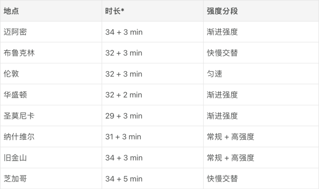最近深圳的差天气屡成头条,户外跑步自然搁置。加上附近游泳馆也暂停开放早场,早上运动的刚需只能留在房间里实现。想到上个月 Apple Fitness+(苹果的健身课程订阅服务)新提供了一类「Time to Run」音频陪跑课程,而且根据宣传,这类课程也适用于室内,我便拿出阻力带,尝试用「Time to Run」来为自己的土法御寒增添几分 阳 洋气。「Time to Run」和此前的「Time to Walk」系列同属于「有声锻炼」(Audio Workouts)课程。每次课程长度都是略长于半小时,用户在 Apple Fitness+ 教练的指导下,沿着一条假想的城市路线完成跑步。配乐歌单由教练挑选,用苹果的话说,「旨在匹配每次跑步的强度、地点和训练内容,反映相关城市的精神。」截至本周,这个系列总共发布了八节课程,「选址」除了一节在伦敦,其他都在美国,大致覆盖率了其东西南北中各个区域。在接连三个阴沉的早上,我每次选择两条路线,加上之前在户外的短暂体验,算是基本通关了这些课程。对于这系列课程,我的主观评价介于良好和优秀之间,下面按照优缺点顺序分别说明理由。▍优点编排用心,张弛有度。对 Fitness+ 的现有评价普遍肯定其符合苹果出品水准的课程质量,Time to Run 也继承了这一优点,训练结构清晰且细节到位。每条路线开头,教练都会开门见山地介绍本次训练的时长和分阶段目标。尽管时间相近,训练的安排也不是千篇一律的;现有这几条就已经覆盖了全程匀速、全程 HIIT(高强度间歇)、半程匀速和半程 HIIT 组合等形式(见下表)。接着,教练便会切入一段两三分钟,节奏明快但又不过于激烈的配乐,用来引导用户逐渐提高步频、进入状态。 * 加号前后分别为实际跑步时间和结束后的休息配乐时间。 在每阶段开头和结尾,教练也都会及时通过引导词来提醒调整步伐、呼吸和姿态。对我这样的业余选手而言,跑到半途后,心态和形态懈怠是难免的,这样的保姆式提醒就显得及时且有用。引导词还会采用一些创意设计来呼应课程的城市主题。例如,伦敦和芝加哥路线中,教练就以这两座城市英文名首字母组词,分别作为相应路线各个分段的主题。一些细节也很到位。例如,考虑到兼顾户外跑的场景,当课程到中途时,教练还会提示锻炼已经过半,下一个路口就该掉头返回了。Time to Run 另一项值得称赞的设计、也是音频系列不同于其他 Fitness+ 课程的特征在于,训练的时间是开放的,显示的时长只是一个下限。在预定路线和歌单结束后,教练会提示后面还有一首歌的时间供你随意安排。如果没有尽兴,可以一直接着跑下去而不用停下来另外开始一次训练;而如果觉得训练量已经足够,也可以就此打住。配乐质量较高。这是意料之外的。习惯使然,我几乎从来不听音乐跑步,而都以播客作为背景音;为了安全和舒适,我一般戴 骨传导耳机 跑步,人声是这种耳机唯一能胜任的音频类型。此外,我听音乐的范围非常「死板」,曲库里绝大部分都是粤语、华语和日语(按比重降序排列)的慢速、小调流行乐;Fitness+ 作为一项主打欧美市场的健身服务,其配乐当然以快节奏,能「鼓舞人心」的英语歌曲为主,与我的听歌取向可谓南辕北辙。因此,在之前使用 Fitness+ 时,我都倾向于把音量调低,而根本不去关注背景音是什么。但跑步场景下的背景音似乎确有特殊加成效果。如上面所说,我这几天是用阻力带在室内原地跑。在没有室外环境作为参照物、也没有跑步机来辅助配速的情况下,仅靠个人意志和脑海估测,是不足以准确达到所需的心率和步频区间的。这时,和课程编排同步的选曲就显得非常实用了:只要跟着节拍迈步,基本就能达到预定的锻炼效果。 虽然听起来有些低级,但对于跑步这种体能消耗较大,没有额外脑力用作理性计算和思考的场景,服从身体对「动次打次」的本能响应,确实行之有效。此外,教练也没有仅仅把音乐作为工具,而是像一个合格的 DJ 那样,在切入每首歌之前认真介绍其年代、主题、创作等背景信息,与主题城市的关联,以及对这首歌的个人感受;这为训练过程增添了一些人情味。▍缺点城市主题的形式大于实质。尽管这是 Time to Run 的主打功能,但在我看来意义相对有限。Time to Run 并不是第一个试图将跑步「场景化」的课程。早在 2012 年,iOS 平台就有一款颇有人气的类型跑步应用 Zombies, Run!,帮助用户在假想的「僵尸大逃亡」场景中跑步。早年流行的跑步记录应用 Runtastic(已被阿迪达斯收编)也曾推出过称为「故事陪跑」(Story Running)的功能。然而,似乎并无依据能表明这种「虚拟场景跑」对于锻炼状态或效果的促进作用;一些研究还发现「游戏化锻炼」对于心率和自我评估的愉悦、体能等造成的差异甚小。在我的实际体验中,试图通过语音描述来达到身临其境的效果还是有些牵强了。 对于那些有实地感受的地标,例如纽约的布鲁克林桥、DC 的国家广场、旧金山的 Castro 区,我大抵还能在脑海中回忆出实地景象,甚至具体地势坡度带来的不同「脚感」。而对于没有去过的伦敦、迈阿密等地,教练再眉飞色舞的叙述也只能是左耳进右耳出。至于在 Apple Watch 表盘上不时展示「实地照片」、提示用户抬腕观看的设计,似乎刻意设计的痕迹过重,在气喘吁吁的跑步过程中很难说算调剂还是打扰。实际上,哪怕苹果进一步精编脚本,让 Time to Run 在脑海中的「建模精度」进一步提高,我的评价可能仍然如是。对我而言,跑步
