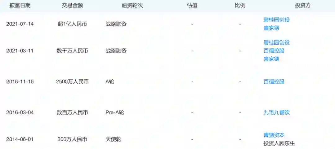 此时距离遇见小面上一轮融资只过去了3个多月。2021年3月份,遇见小面刚刚完成一轮战略融资,金额数千万元人民币,投资机构有碧桂园创投、百福控股和喜家德。当时遇见小面的估值只有约10亿元。