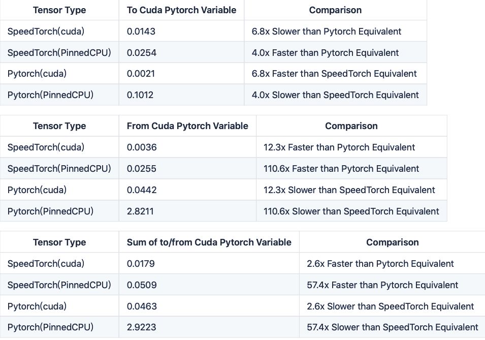 下表是结果摘要。在同样情况下,将数据从 PyTorch CUDA 张量传递到 CUDA PyTorch 嵌入变量上是要比 SpeedTorch 更快的,但对于所有其他的传输类型,SpeedTorch 更快。对于转移到 Cuda Pytorch 嵌入,或从 Cuda Pytorch 嵌入转移的两个步骤的总和上来说,SpeedTorch 比常规 GPU 和 CPU Pinned 张量的 Pytorch 速度同样快。
