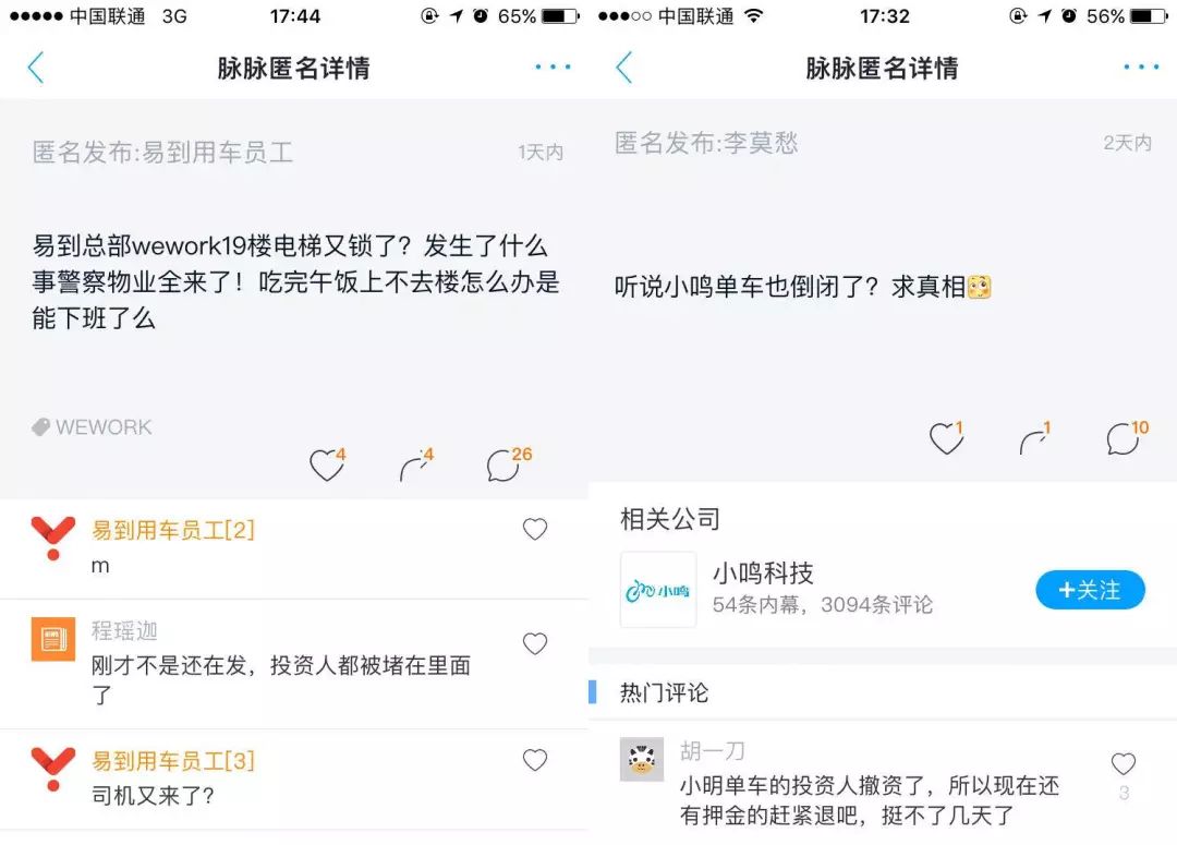 在脉脉的匿名讨论区,经常可以看到诸如“ofo小黄车挪用60亿押金”、“我工作三年,最近想换,拿到了京东offer,20k/月”、“摩拜裁员”、“某公司高管睡了自己的女下属”等言论。