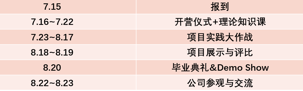 训练营时间为 2019 年 7 月 15日-8 月 23 日,共 5 周,流程安排如下:
