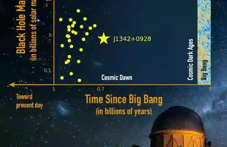 ○ 新发现的超大质量黑洞 J1342+0928 (黄色星星),要比先前观测到的(黄色点点)更加遥远。 | 图片来源:Jinyi Yang/Reidar Hahn/M.Newhouse