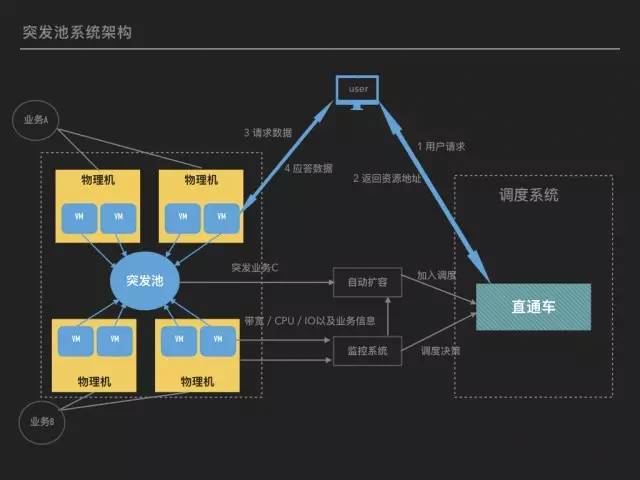 c) 调度系统:突发业务的突发性和体量大两个特点,使得相比域名调度系统,直通车更占优势。直通车调度更灵活,生效时间快,能达到分钟级。