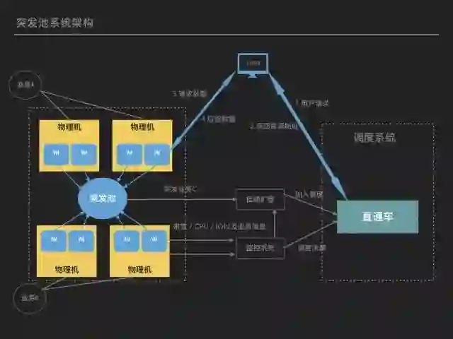a) 突发池:在各平台物理机的上层,由Docker虚拟机组成的资源池,对CPU/内存/磁盘等使用进行了限制,防止对物理机造成影响。原有业务依然部署在物理机上,不用调整。