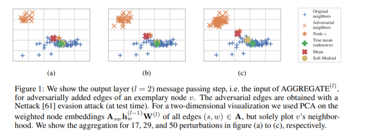 以图结构为目标的扰动已被证明在降低图神经网络(GNNs)性能方面非常有效,而传统的防御手段如对抗性训练似乎不能提高鲁棒性。这项工作的动机是观察到,反向注入的边缘有效地可以视为一个节点的邻域聚集函数的额外样本,这导致扭曲的聚集在层上累积。传统的GNN聚合函数,如总和或平均值,可以被一个单独的离群值任意扭曲。在鲁棒统计领域的启发下,我们提出了一个鲁棒聚合函数。我们的方法显示了0.5的最大可能分解点,这意味着只要节点的对抗边的比例小于50\%,聚合的偏差就有界。我们的新聚合函数,软Medoid,是Medoid的一个完全可微的泛化,因此很适合端到端深度学习。在Cora ML上配置聚合的GNN,可将结构扰动的鲁棒性提高3倍(Citeseer上提高5.5倍),对于低度节点,可提高8倍。