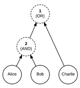 比如下面这个例子中,三人的公钥权重默认都是1,那么整个command有效的条件是:“alice和bob都要签名”或“只要charlie签名”。