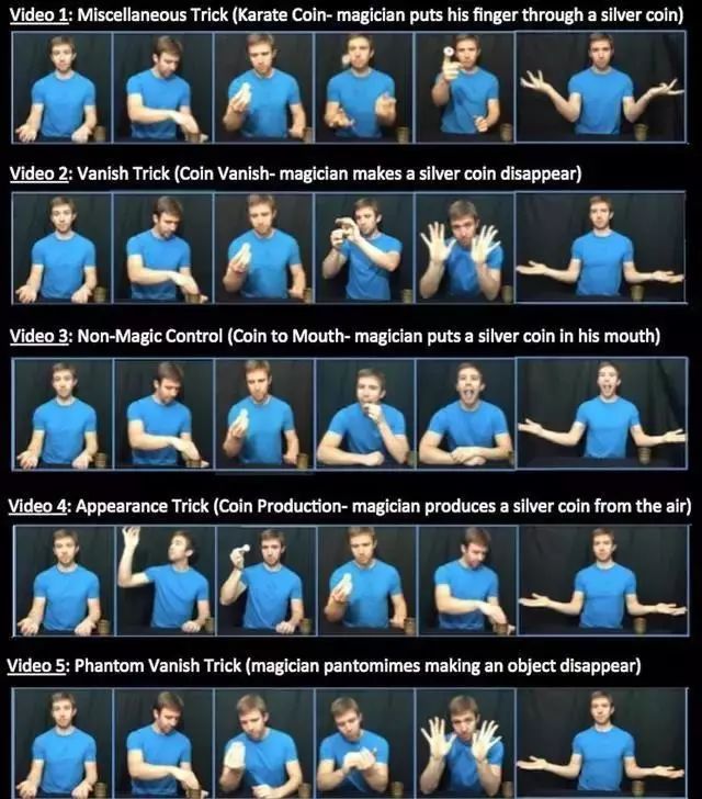 在五段视频中,其实只有第一、二、四段是真正的魔术表演,戏法包括让物体凭空消失或变出,改变物体颜色,手指穿刺硬物等。第三段视频中没有展示任何魔术手法,片中人只是将普通的物体放进嘴里。而在最后一段视频中,魔术师煞有介事地做完了整套“物体凭空消失”的魔术手法,但事实上,他手里根本没有任何东西。为了排除魔术道具自身的干扰,实验者共准备了五套不同的魔术道具,随机分配一套给被试观看。魔术道具分别为硬币、小球、筹码、手帕、以及蜡笔。