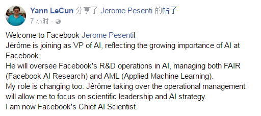 人工智能领域的重量级人物 LeCun 宣布最新动态,他在 Facebook 帐号上宣布,他已经卸任 Facebook 人工智能研究院(FAIR)院长一职,并转为担任首席 AI 科学家,专心从事研究工作,并欢迎 Jérôme Pesenti 加入,将同时统管旗下 AI 两大研究单位:FAIR 以及应用机器学习部门(AML,Applied Machine Learning)。而 Jérôme Pesenti 曾任英国医疗保健 AI 创业公司 BenevolentTech CEO、IBM 大数据部门 CTO。