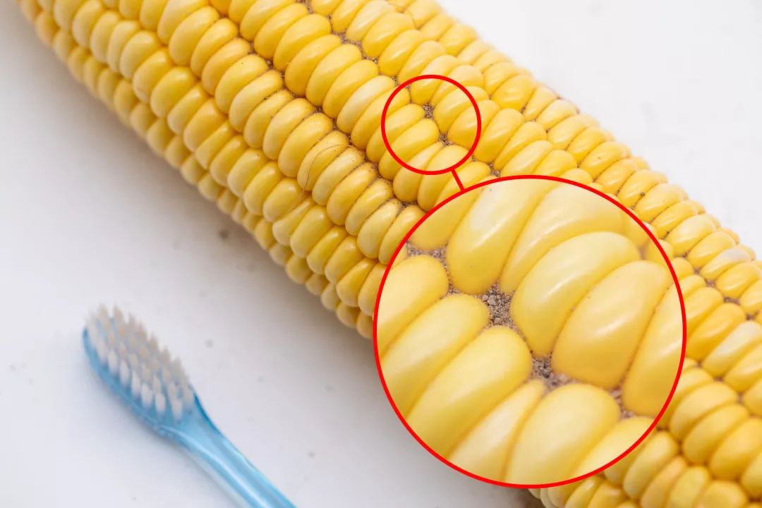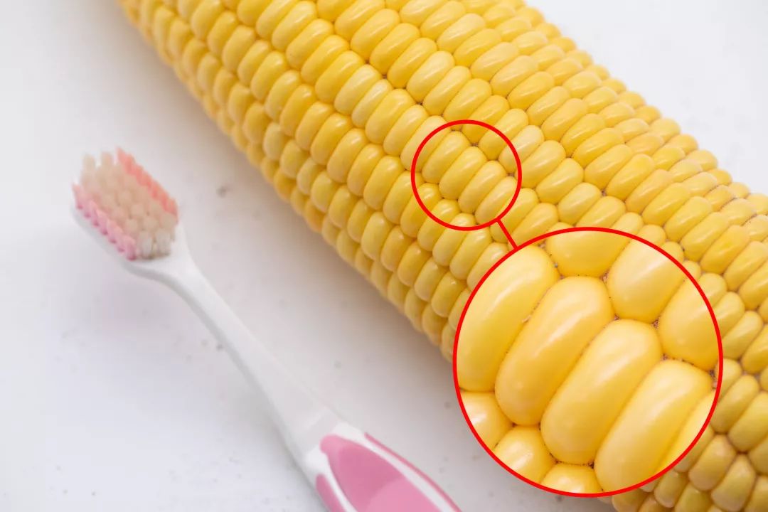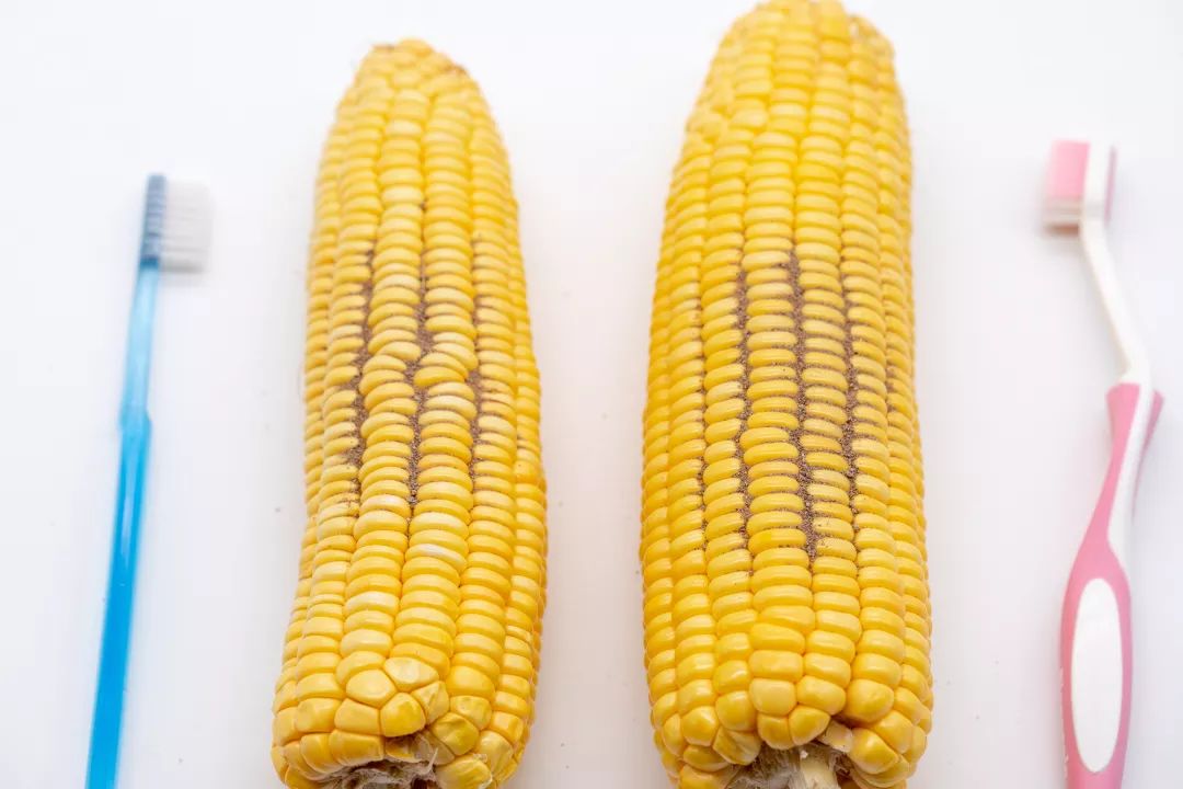 最后真的能十分清晰的看出来,传统牙刷刷完后,玉米内还有很多泥土。