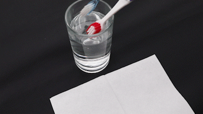 我们将使用过贝利达牙刷和普通的牙刷,简单的冲了下水,分别取了点刷毛,放在培养皿中。
