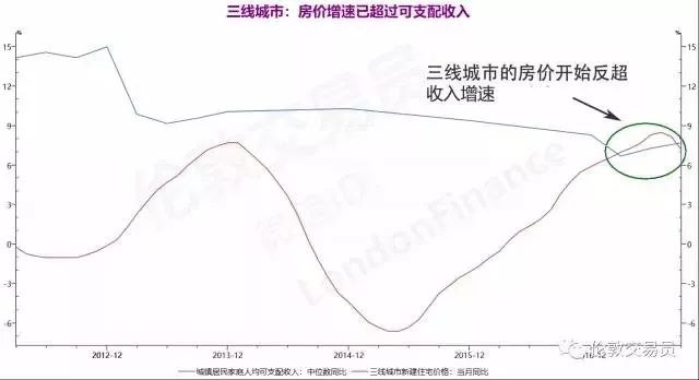 但是,到今年我们可以看到三线城市的房价增速实际上已经超过居民可支配收入的涨幅。