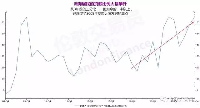 银行也开始意识到向居民贷款的投放力度过大。今年接近60%的新增贷款都投到了居民部门,五年前,这个数字只有约30%。