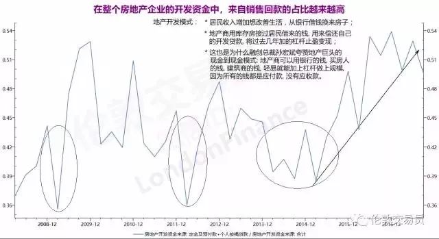 在整个房地产企业的开发资金中,来自销售回款的占比越来越高。这里面包括了两部分:一部分居民本身的首付资金,还有一部分居民通过银行获得贷款。