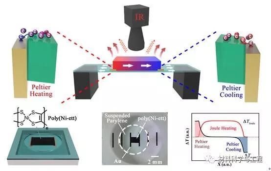 近期,在科技部国家重点研发计划、中科院战略先导研究计划和国家自然科学基金委项目的支持下,科研人员针对有机热电器件帕尔帖效应研究中面临的热效应复杂且相互干扰问题,结合悬浮器件的制备和原位真空表征系统的搭建降低热散失,利用高速/锁相红外技术实现帕尔贴效应与焦耳热效应及热传导的有效分离,系统揭示了有机热电薄膜器件中的帕尔贴效应并实验验证了有机热电体系中的汤姆逊关系。更为重要的是,他们发现poly(Ni-ett)薄膜器件两端可以建立超过40摄氏度的温差,并且首次真正实现了有机热电器件的电致制冷。