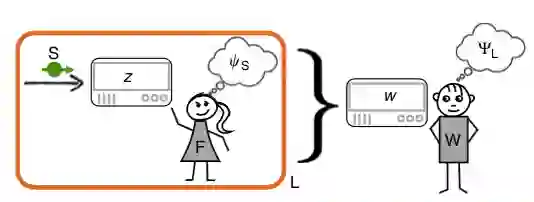 ○ 维格纳的思想实验:F在垂直方向上测量一个银原子的自旋S,获得结果z。从F的角度来看,S的自旋是一个已知的纯态。在盒子外面的W,会将包括F在内的整个盒子视为一个大的量子系统L(橙色盒子),因此W会给系统L指定一个叠加态。| 图片来源:[1]