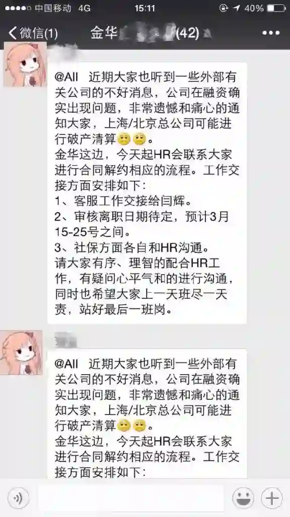 此后不断有消息传出,微博用户“直播点吧”接到爆料还显示,目前熊猫直播公司所有福利全部取消、居住证也停办;金华分公司全体解散,客服周一已全体离职,只剩下审核,将于15号全部离职。金华分公司微信群中通知显示,“公司融资确实出现问题,上海/北京总公司可能进行破产清算”,金华分公司则已经开始员工解约流程;此外,虎牙直播开始在熊猫直播群招人…该用户还透露,“除此之外还有一些工会私信我说欠他们好多钱,今天下午又有人去公司讨债了……”