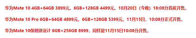 价格上,华为Mate10 Pro 6GB+64GB版本的起售价为4899元。
