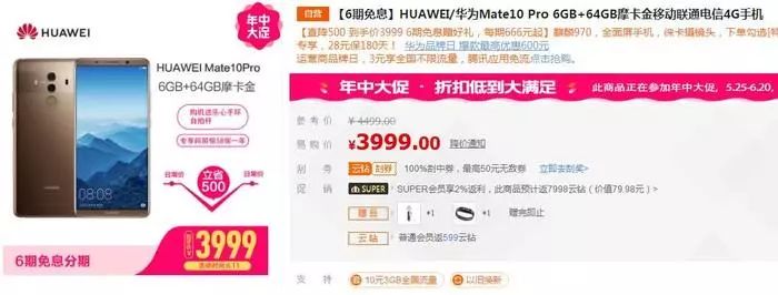 华为Mate10 Pro从上市到第二年的6月份,经历8个月的时间,价格从4899元跌至3999元,降价900元,跌幅19%。