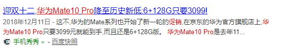 再到第二年12月份,发布14个月后的Mate10 Pro跌至3099元,降价1700元左右,跌幅37%。