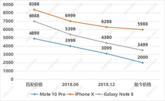 如今华为Mate10 Pro的新机已经很少了,都是些第三方的店铺在售卖,售价大约2000元,跌幅60%。Note8跌幅大约50%,同期的iPhoneX跌幅大约28.7%。