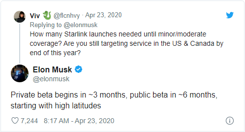 马斯克发推特说,星链内测差不多三个月后开始,公测六个月以后。